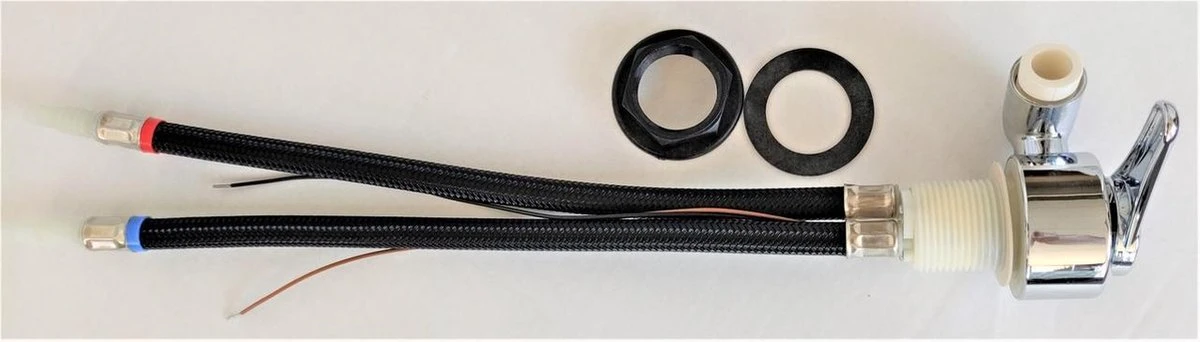 Twee slangen van 30 cm met thule aan de onderkant voor warm- en koud water, Slangen zijn voorzien van slangthule van 8 mm.