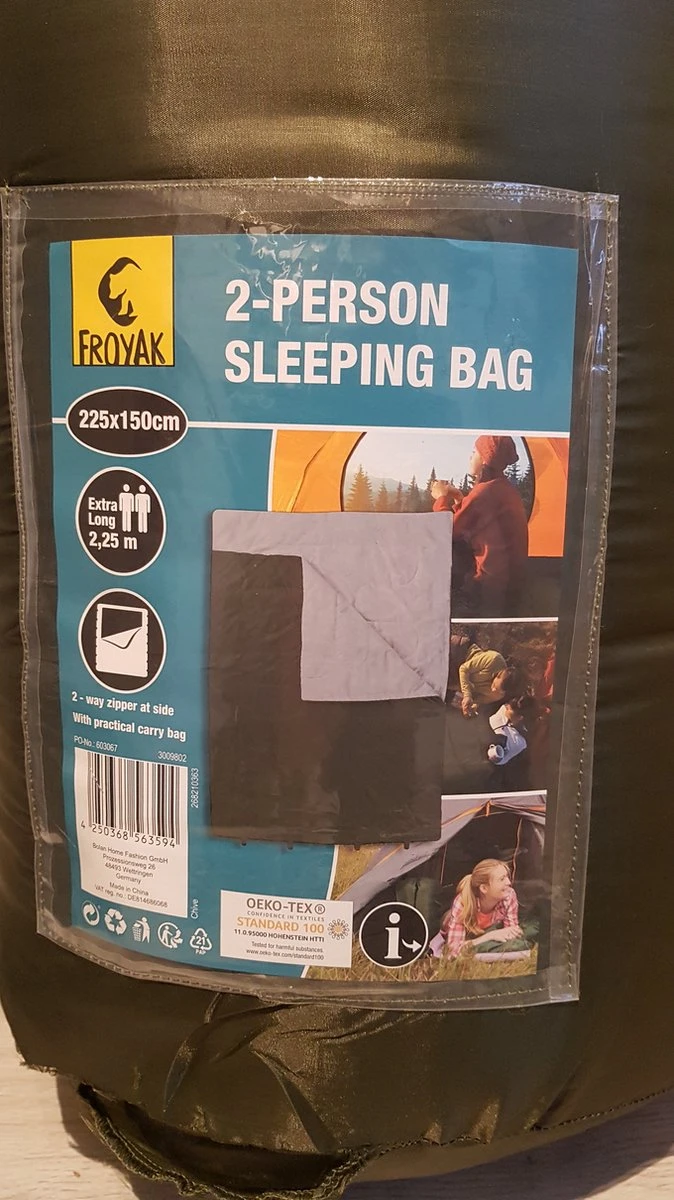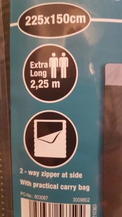 | Verpakkingsinhoud | Een 2 persoons slaapzak envelop model. |