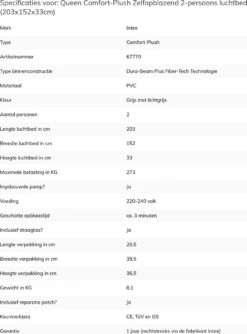 Het Intex Comfort-plush Full Luchtbed is een verlaagd, extra sterk en comfortabel luchtbed. Het luchtbed is voorzien van een duizenden sterke polyester vezels waardoor hij sterker en comfortabeler is dan normale PVC luchtbedden. Dankzij de ingebouwde pomp is hij snel opgeblazen waardoor het luchtbed geschikt is voor een logeerpartijtje of kampeervakantie.